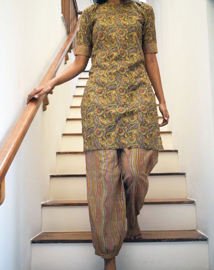 Add a touch of traditional elegance to your wardrobe with Tara's beautiful Kalamkari set! Featuring intricate hand-painted Kalamkari designs, this set is a true masterpiece.