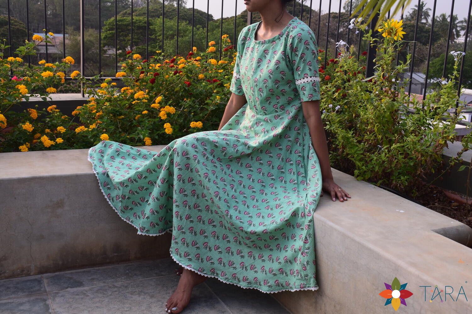 Step into Tara's gorgeous green floral cotton dress for women made with soft and breathable cotton material, this dress is perfect for any occasion, from a day at the park to a garden party.