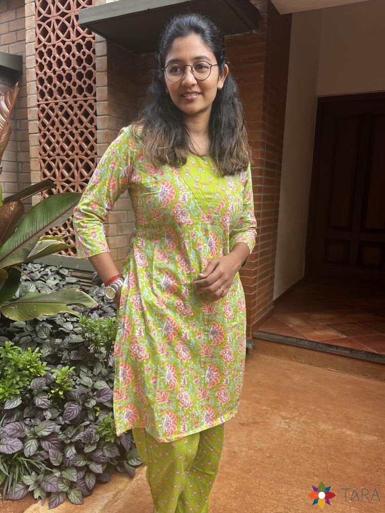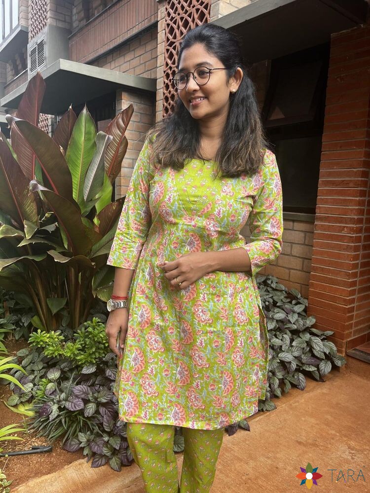 Indulge in the blissful comfort of Tara's cotton kurti sets, designed with your ease in mind. Crafted from 100% cotton and adorned with convenient pockets, our sets offer effortless style and functionality for the modern woman on the go.